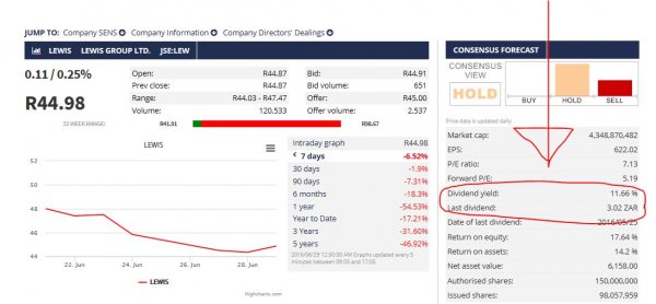1. JSE:LEW actually looks more attractive: for example: Lewis Group LTD (JSE:lew) has a current price of R44.98 per share, and a dividend of R3.02 per share. - If I buy 100 shares: R44.98 x 100 = R4498, - wait until 2016/07/11 for the payout of R3.02 x 100 = R302 - sell the shares again. - getting R302 from the initial amount of R4498 means a growth of 6.7% in a week. - (ignoring fees etc., and my total lack of how financial maths works...) Although only slightly more than Invicta, but the lower share price means I could buy three times as much and save on the fees...