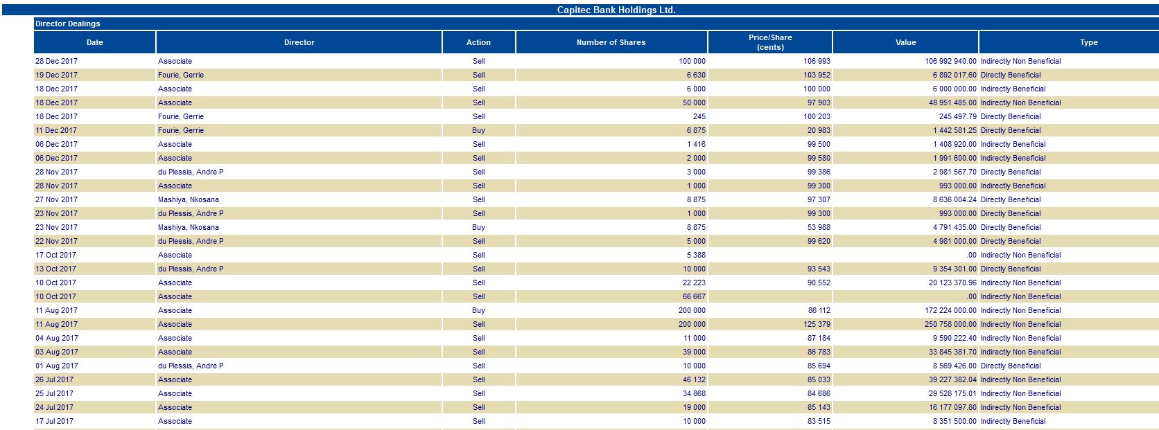 What worries me is the massive sell-off of shares by directors lately. It gives the impression that Capitec is overvalued at the moment. Looking at the Directors' dealings over the past six months, almost all trades by directors are sells, and large volumes too...